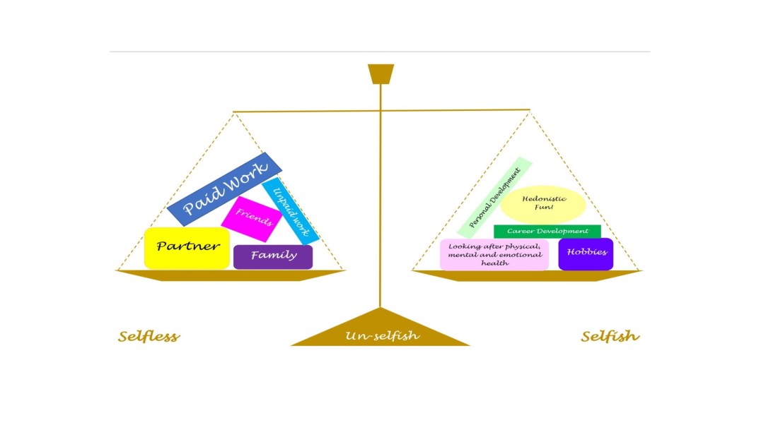So, I see it as a spectrum from Selfish to Selfless; at one end I’m “all about me” and at the other end I am exhausting myself in service of others or some form of work (not necessarily paid work). But there is a happy medium. What to call this? I have seen it referred to as “Self-full”, so a place where you take care of your own needs first and from that position of strength serve others. It’s maybe my conditioning but that terminology doesn’t really appeal – to me it suggests I cannot serve others until I have done everything I need; which sounds a little bit selfish. Perhaps a more appealing term would be “Unselfish”? In my mind this suggests a sensible balance of self-care and purpose. It might also be seen as equal measures of hedonic and eudemonic wellbeing – hedonic being pure pleasure/ enjoyment and eudemonic being more about feeling worthwhile.