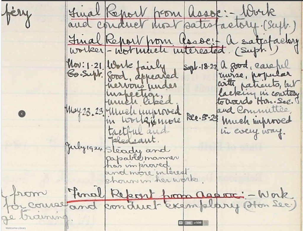 In 1920 she moved to Gloucester to commence midwifery training and later moved to London. We have the privilege of seeing her nursing register entries, reporting Mary Ellen as a hard-working nurse, popular with staff and patients. My favourite entry though is from September 1922 that reports her as “lacking in courtesy towards the honorary secretary and committee”. I am going to assume that this identifies her as being brave enough to question her superiors; a bold move for a woman from such humble beginnings.