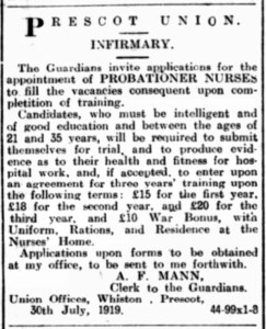 Mary Ellen Foster was born on 24 July 1893 to Joseph, a coal miner and his wife Margaret. They lived  in Rainford – a small village in the North West of England; and Mary Ellen was the sixth born of fourteen children. On the 1911 census we find 17 year old Mary Ellen in service at a farm. Five years later she enters nurse training at the Prescot Union Infirmary, the hospital associated with Prescot workhouse and the forerunner of Whiston Hospital. I imagine she had seen an advert something like the one below.